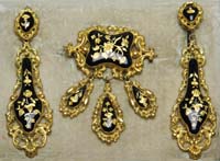 FRAMED HAND PAINTED PORCELAIN PLAQUE SIGNED ERNEST RIESE. Oval painting on porcelain half-portrait of a young woman with black hair wearing a red robe. She wears an ivory wreath in her hair and one hand is held up by her neck. Signed on right middle “Ernest Riese”. The back is impressed mark “12”. Housed in a gold painted leaf decorated brass frame. SIZE: 5” x 4”. CONDITION: Very good. 9-73243 (400-800)