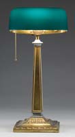 LEADED GLASS TABLE LAMP. Shade having a shaped edge with flowers and green leaves. Unmarked shade. Base signed “EM & Co. 7150”. First half of the 20th Century. SIZE: 21” total h. Shade is 18-1/2” dia. Opening of shade is 3-1/2”. CONDITION: Generally very good. 9-74047 (250-400)