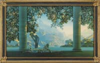 MAXFIELD PARRISH (American, 1870-1966) “DAYBREAK”. Framed colorful print shows nude boy standing over figure with mountain background and large columns. Housed in a period frame. Signed in print “The House of Art, NY”. SIGHT SIZE: 17-1/2” x 29-1/2”. CONDITION: Very good. 9-74060 (200-400)