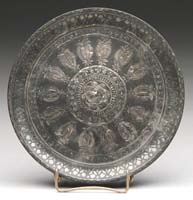 SET OF THREE STERLING SERVICE PLATES BY TIFFANY & CO. The plates marked “Tiffany & Co. 18887 Makers 16338 sterling silver 925-1000 M”. The plates have a quadroon type edge with leaf decoration. Two plates have monogram “B.P.L.” on back. One inscribed “December 1925” on back. All three have an engraved coat of arms on border of front. WEIGHT: 698, 714, 732 grams each, 2144 total, 69 troy oz. SIZE: 11” dia. CONDITION: Good. 9-73334 (1,250-1,750)