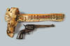 *COLT NEW SERVICE DA REVOLVER. Cal. 45 Colt. SN 29939. Blued finish with 7-1/2” bbl, fixed sights, checkered deep medallion fleur-de-lis carved walnut grips and a lanyard loop in the butt. CONDITION: Good. Overall retains 65-70% dull original blue with some light nicks and a spot or two of light rust. Grips show heavy wear with a crack at the right heel, crisp mechanics, strong bright bore with scattered light pitting. 4-53023 JR677 (350-600)