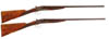 LOT OF 2 EARLY SHOTGUNS. 1) August Viaux Dbl Bbl Pin Fire. Cal. 14 ga. SN 726. Beautiful French pin fire with 29 5/8” Damascus bbls, dbl beads with the maker’s name and address relief engraved on the top rib. It has an under-lever action without forearm, and is lightly game scene engraved with dogs, stag and raebuck, surrounded by light arabesque patterns and gold wire inlay with very fancy trigger guard. The stock is beautifully figured walnut with straight grip and smooth steel buttplate. It has sling swivels. CONDITION: Fine. Bbls retain 50-60%, or more, dark Damascus pattern. Receiver, lockplates and hammers along with trigger guard and buttplate are a smooth gray metal finish and the wood retains most of an old refinish. Dark moderately pitted bores. Mechanics fine. 2) 1889 Remington. Cal. 12 ga. SN 225803. 30” bbls, choked FULL/FULL. Splinter forearm, semi-pistol grip stock, and Remington logo hard rubber buttplate. CONDITION: About good. 75% Damascus pattern, 50% faded case colors on the lockplate, receiver turned silver. Buttplate has a chipped toe, wood is sound with 60% original varnish on the buttstock, worn and dark bore. Rear forearm screw is a replacement and is stripped. 4-52244 JR81 (500-1,000)