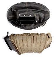 One canvas (Hülsensack alte Art) and one rubber (Hülsensack neue Art) empty case catchers for MG15. Both have blued metal flange/latch that attaches to gun ejection port. Tan canvas bag is held open by a large internal circular spring, coin purse style closure at bottom opens to empty spent brass, stitched leather reinforcements where canvas attaches to metal fittings. Metal flange has “HK” in circle and “HS” in circle followed by an eagle/2 Luftwaffe acceptance mark. “Rubber Football” new model case container attached to other example has zipper on bottom with leather lanyard to release fired shells. Metal catcher is marked “FL45717” next to “baa/41” in a circle and “BA/4202” in an octagon. PROVENANCE: Collection of Dr. Geoffrey Sturgess. CONDITION: Fine, both metal catchers retain 98% orig finish with some minor scratches and corrosion. Gray rubber on “Football” is excellent with little wear, leather lanyard on zipper is worn and cracked. Canvas on old model catcher is stained from internal spring, leather has normal wear with orig color and stitching. Coin purse closure has patina with minor wear. 43475-1081 BWS (2,000-3,000) – Lot 3797
