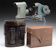 SN NA. 1) Light green E. Leitz/Wetzler marked on left side. SN 5340 stamped on left. Periscope configuration with vertical adjustment dial. Rubber eye shield “3906” painted on right side. Black leather case with two belt loops and two leather closure straps with metal studs. Leather lid has matching “3906” painted on top. 2) Emil Busch marked periscope-style configuration SN 54746. Vertical adjustment dial on side. SN 54660 on base. Hard rubber eye shield. Metal cap cover with lanyard on front. PROVENANCE: Collection of Dr. Geoffrey Sturgess. CONDITION: 1) Scope retains 97% orig light green paint. Optics are clear. Eye shield is deteriorating on outer edges. Case is worn with normal cracking & flaking on edges & creases. Stitching has been dyed. 2) Retains 95% green paint. Rubber on eye shield is intact. Optics are clear. Leather lanyard ha little wear. Case is solid with minor staining. Dye is worn through on belt loop crease. 43475-1101 BWS (2,000-3,000) – Lot 3800