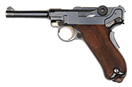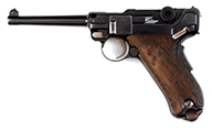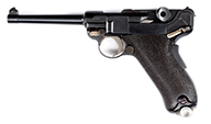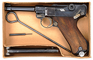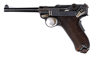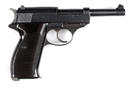 SN 4542. Cal. 9 mm. 9.9″ bbl. This 1942 manufactured MP-40 is particularly desirable because it apparently has all matching visible parts including sight hood, bbl, bbl nut, receiver, bolt, lower assembly cap and swing out shoulder loop. It is also unusual because the parts almost without exception were all manufactured by Steyr. Numerous eagle “WaA 623” proofs on metal parts with “bnz” marks on lower assembly buffer cup and next to rear sling slot. Only the trigger appears to have been from a different sub-contractor which is an eagle over “WaA 818”. Bbl resting bar is not present but retaining pin is. This absent part is readily available from numerous sources. Very little play in the extended shoulder loop. This lot includes two orig Nazi marked 32-rnd magazines. Firing mechanism moves smoothly when operated by hand. This weapon appears fully functional. This is a National Firearms Act item and requires BATF approval for transfer. Although registered as SN 4542 the actual SN is 4542d. This can be requested for correction upon transfer. CONDITION: Overall finish and appearance very good to extremely fine with over 85% coverage, thinning to a grey patina on the bbl and also somewhat thinning on the receiver tube with loss of finish to all high points. Loss is consistent allowing the presentation of this firearm to remain very attractive. There is a more significant loss of finish just forward of the trigger guard where it is a uniform grey patina. Bore has strong, shiny rifling with some light corrosion just starting at the edge of the grooves. Overall a very fine collectible specimen, especially with its matching bolt and other parts. 49296-14 JWK32 C&R (10,000-15,000) – Lot 3773