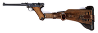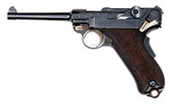 SN 25279. Cal. 9mm. 8″ bbl. This MP 18.1 is one of the ones retrofitted by C.G Haenel with the 90 degree magazine housing and takes “C.G.HAENEL” manufactured stick magazines. Although these guns were originally fitted with angled magazine housings for the 32 rd Luger snail drum, after WWI many were retrofitted to take stick magazines which were considered an improvement for ease of manufacture and maintenance. This machine pistol is marked on top of its magazine housing “S.B. 848” (Schutzpolizei Berlin, Item/Weapon 848. It is also marked below the model markings with a “K” below a sunburst proof mark. Also marked below SN on the receiver with a Crown over “No” proof mark. Magazine housing is marked as manufactured by C.G. Haenel as is magazine. Receiver, bbl shroud, sight, magazine release latch, dis-assembly latch and lower assembly hardware including trigger guard and buttplate match SN. Bolt is numbered 5183. Magazine is a re-number to “24041”. Buttstock also matches SN and is dated “1920” on left side. There is a vacant threaded hole immediately forward of the bbl retention screw and this together with the mismatched bolt and the information on the current form 3 manufacturers block indicate that this is probably a re-activated gun that was at one time a “DEWAT”. It is fairly common that when these guns were re-activated the person who re-activated the gun would be listed in the manufacturers block. Included with this lot is a fine condition reproduction leather sling and one 20 rd magazine. Firing mechanism moves smoothly when operated by hand, this weapon appears fully functional. This is a National Firearms Act weapon and BATF approval of transfer is required. Current form 3 has an individuals name in block 3A under “Manufacturer/Importer”, although the gun certainly is as manufactured originally by Bergmann and C.G. Haenel. It is possible to request a correction through the BATF upon transfer. CONDITION: Overall finish and appearance is extremely fine to near excellent with what appears to be a dipped refinish, there are numerous very tiny pit marks underneath the bluing with a very small area of light pitting on the underside of the trigger guard assembly in line with the SN. Bolt is in the white. Lower assembly hardware within stock has a beautiful deep lustrous blue finish. Stock has some light handling marks and dings and has been lightly sanded but still presents very well and retains its visible Crown cartouche. Leather sling is near excellent and completely serviceable on what appears to be orig stock attachment hardware. Bore is extremely fine, shiny and bright with some very light pitting. This is a fine and handsome example of an early Sub Machine gun as issued during the Weimar era in Germany without any Nazi proof marks in evidence. 49658-1 JWK61 C&R (12,000-17,000) – Lot 3769