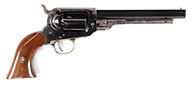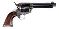 SN 338905. Cal. .44 WCF. 5-1/2″ bbl, blue and casecolored finish, 1-pc walnut grips. CONDITION: Revolver shows 95% of the blue finish overall and 70% of case hardening, action is crisp, front sight is full size. Grips are not original to this gun. Very nice frontier. 49433-97 TEP C&R (3,000-5,000) – Lot 1056