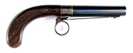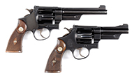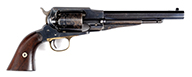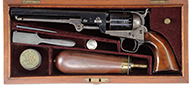 SN 147701. Cal. 41. 6″ rnd bbl, blue and case color finish. Checkered hard rubber grips. SN’s on frame, trigger guard, backstrap all match. PROVENANCE: The Estate Collection of Phil A. Bleakney, Jr. CONDITION: Very good, bbl retains 50% bright blue blending with a plum patina, slight scratches and some muzzle wear. Front sight is full size. Bbl address is sharp, cal. mark is sharp. Bore is bright with some staining and strong rifling. Ejector rod shows 80% blue with high point wear. Cylinder retains 60% blue with scratches overall, no heavy pits, deep blue in flutes. Frame retains 60% muted case color with some vivid color in protected areas. Frame screws retain 50% blue. Trigger retains 50% blue. Hammer retains 30% blue in protected areas. Trigger guard and backstrap retain 30% blue blending with a pleasing plum patina. Grips are very good with some high point wear and a couple of minor dents. Mechanics function well. Nice Thunderer in a rare bbl length. 49059-98 TEP C&R (1,000-2,000) – Lot 1048