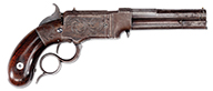 SN 191. Cal. 32 RF 24″ bbl, blue finish, walnut stocks. Bbl has a Beech combination front sight and a unique ladder rear sight with no markings. Bbl is also unmarked. Action opens using knob on right side of receiver to swing bolt out to side. Rear tang sight is also very unique, possibly one-of-a-kind. CONDITION: Very good. Rifle shows a pleasing plum brown patina overall with some bright blue remaining in protected areas of frame. Receiver has traces of bright blue. Trigger guard shows 20% blue with some staining. Stocks are very good showing most orig varnish with marring mostly on left side of buttstock. Buttplate is faceted and shows 20% blue with some rust stains. This is a very rare seldom seen rifle made around 1870. 49468-3 TEP (2,500-4,000) – Lot 1038
