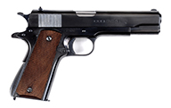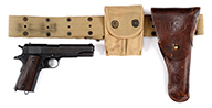 SN 66123. Cal. .45 acp. 10 1/2 bbl. Straightforward fine original Reising folding stock model 55 with typical H & R markings on top of receiver, and also an orig 20 rnd magazine. Magazine marked “H & R-REISING, M 50 – CAL. 45 MAGAZINE. Also included is a reproduction tan sling. Large deeply stamped “P” proofmark on bbl with a smaller more lightly engraved “E” just to right of the “P” on bbl. Firing mechanism moves smoothly when operated by hand. Folding wire shoulder loop properly deploys and snaps into place. This weapon appears fully functional. This is a National Firearms Act item and requires BATF approval prior to transfer. PROVENANCE: The class III weapons formerly on loan to Evergreen Aviation & Space Museum. CONDITION: Overall finish and appearance is fine with about 85% of its smooth gray-blue finish remaining with some areas of cleaned pitting on top of bbl, left side of receiver, and left side of magazine housing where finish has been scraped thin with some brown surface corrosion remaining. Magazine is a deep lustrous blue finish and extremely fine. Wood is fine with some light dings and handling marks. Shoulder loop extremely fine and serviceable. Web sling near excellent condition. Bore is extremely fine, shiny and bright. The Reising, although not as popular with troops as the Thompson, fires from a closed bolt generally making for a higher potential of an accurate first shot. 49651-1 JWK45 C&R (8,000-15,000) – Lot 3752