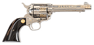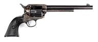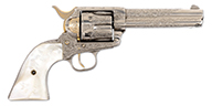 SN 283927. Cal. 45 LC. 4-3/4” bbl, blue finish, checkered hard rubber grips. CONDITION: Very fine as refinished after engraving. Revolver retains 90% blue finish on bbl, grip straps, and cylinder. Muted case colors on frame and hammer hidden by engraving. Grips are good with no chips. Engraving is done in a very fine style with almost full coverage. Engraving is scroll type and very tight. Even the hammer and front sight are engraved. This a very attractive engraved single action. 49492-2 TEP C&R (3,500-5,000) – Lot 1054