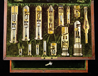 SN NA. Metal calculator is 17″ overall with SN 751 & crescent moons in a fitted wooden case with leather lid and leather harness with carry strap. Case is 18-1/2″ overall. Leather bands that holds closure strap is numbered 919. PROVENANCE: Collection of Dr. Geoffrey Sturgess. CONDITION: Fine, calculator has very little wear. Orig gray/green finish on wood case is intact with scattered discoloration and wear on edges. Leather is very good with orig dye and stitching some cracking & fading on creases. Normal wear and scuffs 43475-1095 BWS (2,000-3,000) – Lot 3801