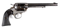 SN 348619. Cal. .38 WCF. 5-1/2″ bbl, blue finish, hard rubber grips. CONDITION: Frame shows 10% casecolor in protected areas, the rest of frame is silver/gray, bbl has 60% bright blue with muzzle wear. Cylinder shows strong blue in the flutes, hammer has 50% casecolor. Original hard rubber grips. Nice honest gun. Comes with a Colt Factory letter confirming all features and showing shipment to Tufts-Lyon Arms Company, Los Angeles, CA., November 12, 1926, in a two gun shipment. 49433-96 TEP C&R (2,500-3,500) – Lot 1058