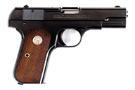SN 140688. Cal. 41 3-1/2″ bbl, blue and case colored finish, checkered hard rubber grips, maroon Colt box with picture label and Ideal loading label on inner lid. PROVENANCE: The Estate Collection of Phil A. Bleakney, Jr. CONDITION: Very fine. Bbl retains 90% bright blue with some muzzle wear and drifting of finish. Bore is frosty with deep rifling. Sharp bbl address and sharp Colt D. A. 41 on left side. Cylinder retains 90% bright blue with high point wear on front edge and along flutes. Frame retains 80% case color with fiery color in protected areas drifting to plum brown on recoil shield and top strap. Fine screws. Trigger guard and backstrap retain 90% bright blue with gray-brown patina on backstrap. Trigger retains 50% fire blue. Hammer retains 95% fire blue. Hammer does not stay on full-cock. Can be repaired. Grips are fine with no serious mars or dents. Box is very good with a clear top label showing a picture of a Colt Double Action pistol. Inner label shows instructions for Ideal Reloading Tool. Box is maroon in color with a blue end label saying .38 Cal. 3-1/2″ rubber and blue without ejector. Some faded pencil marks on bottom of box that are indiscernible. A very nice high condition Colt Thunderer in an original Colt box. 49059-72 TEP C&R (1,000-2,000) – Lot 1046