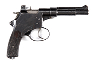 SN 130182. Cal. .38 Colt. Scarce 6″ bbl, blue finish, hard rubber grips. CONDITION: Very good to fine condition. 80% bbl blue with some roughness at the muzzle. 60% blue on all other parts. Traces of vivid casecolor in the corners of the frame, blending into a pleasant brown patina. Nice screws. Very rare bbl length. 49433-105 TEP C&R (1,500-2,500) – Lot 1042