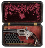 SN 14002. Cal. .38 Colt. 3-1/2″ bbl, nickel finish. Hard rubber grips. CONDITION: Good condition. Engraving appears to be factory or New York style, gun was engraved when it was new. 10% nickel finish on the bbl and cylinder, 20% nickel finish on the frame, traces of blue on the hammer. Very good representative example of an engraved Lightning. 49433-108 TEP C&R (3,000-4,500) – Lot 1040