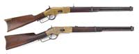 **MARLIN ARMS CO. M1906/1917 ON LOW MOUNT. SN 1309. .30Cal. 28″ Bbl. Adjustable rear sight 100-2600m. Protected post front sight. Complete with two wooden ammo boxes (one post-war and one earlier), and spare rear sight. Dark blue finish. According to consignor the bbl has been vented on bottom preventing it from functioning properly although not visible without disassembling firearm. CONDITION: Very Good. Bbl has sharp rifling but is pitted in some locations. When cycled by hand the mechanism is smooth and appears to function correctly. Rear wooden pistol grip is missing small chunk on right hand side. Bluing appears factory and is dark and thorough. 4-35195 JZ9 (4,000-6,000)