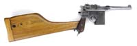 EXTREMELY RARE MAUSER CONEHAMMER 6-SHOT BROOMHANDLE SEMI-AUTO PISTOL. SN 14273. Cal. 30 Mauser. Beautiful & rare Broomhandle – one of 4 known!! 6″ bbl with 50-1,000 meter adjustable rear sight & barleycorn front sight. It has usual chamber markings with crown “U” proofs on left side of receiver & bottom of bolt. Bottom of bbl has three small proofs with tiny “M” proofs on various internal parts. Hammer is early style with stepped concentric rings and it has the scalloped magazine base with protruding release button. Fitted with 23-line walnut grips & has a lanyard stud & ring in butt. Accompanied by a matching numbered orig walnut holster/stock. Few of these rare pistols survive today & of those survivors very rarely is one ever encountered that is all matching especially the holster/stock. PROVENANCE: Doug Smith Collection. CONDITION: Very fine, all matching including holster/stock. Overall retains about 95% strong orig factory blue with only losses from holster wear around bottom of bbl. Small parts retain most of their orig fire blue, slightly thinned on sight slide & firing pin retainer. Trigger retains thin orig straw colors. Mechanics are crisp, bright shiny bore, may have been fired but if so very little. Holster/stock is completely sound with light nicks, scratches & dings and retains most of its period oil finish. Attaching iron & hinge are a gray metal patina. 4-36181 JR224 (12,500-17,500)