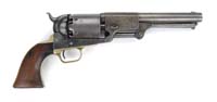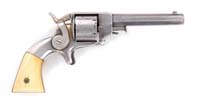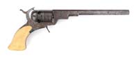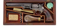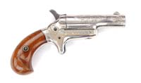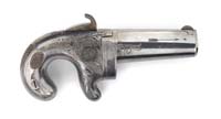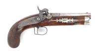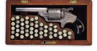 SCARCE CASED TINY WOODBRIDGE PERCUSSION PISTOL. SN NSN. Cal. 32. Tiny vest pocket percussion pistol with 1-9/16″ oct bbl with name “BERRY WOODBRIDGE” on top flat. Bbl has a steel rail on bottom with a tiny articulated captive rammer. Mounted on a boxlock receiver with rounded edges and side hammer, with a full checkered 1-pc walnut grip with tiny oval thumbplate & steel buttcap with trap. Receiver, hammer & appended parts are very nicely engraved with foliate arabesque patterns & a zigzag border. Accompanied by what is probably its orig relined rosewood casing with a rectangular ivory inlay in lid, scrimshawed with a whale. Interior is burgundy felt lined compartmented in bottom for pistol, a tiny faceted brass flask with single cavity, iron, nutcracker style ball mold and an ebony parts box in left rear corner. An open compartment on right side contains lead balls. Front has a mortised brass lock. PROVENANCE: Dr. Frank Miller Estate Collection. CONDITION: Pistol retains a smooth even gray/brown patina. Grip is sound showing light to moderate wear. Mechanics are crisp, unable to check bore. Case has a grain check in lid with a replaced sliver on top right edge. Interior is lightly soiled and intact. Flask & mold are fine. 4-35756 JR393 (2,500-4,000)