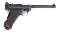 *IMPORTANT & EXTREMELY RARE DWM 1900 LONG BARREL PROTOTYPE LUGER & RIG WITH RARE MATCHING PUSH BUTTON STOCK. SN 10034. Cal. 30 Luger. Extraordinarily rare early Luger with 6-3/4″ bbl with prototype serial number. This prototype length bbl has full serial number which is matching to frame and is stamped “172.28”, indicating the number of lead balls of this size that it takes to weigh 1 pound. It has dished toggles, grip safety, DWM scroll on front toggle link & “BUG” proofs on bbl & “BU” proofs on receiver, breech block & front toggle link. Thumb safety is 2nd type with short domed, checkered pad & it has narrow trigger & grip safety pad. Heel of back strap has the stock lug for the prototype push button stock. Fitted with matching numbered, full checkered wood grips & an orig unmarked wood base magazine. Accompanied by a black leather holster with shoulder strap & orig cleaning rod with oiler. Also accompanied by its orig, prototype, matching numbered board stock with push button attaching iron & its orig stock strap. This pistol apparently came out of Chile in 1990 according to an accompanying certificate from the Banco De Pruebas De Chile, and bears an overlaying “B” and “P” in a shield on the right side of the frame that matches the Banco De Pruebas symbol on the certificate. PROVENANCE: Doug Smith Collection CONDITION: Extraordinarily fine, all matching except magazine, hold open & firing pin which are properly unnumbered, possibly unfired. Overall retains 98-99% beautiful original factory blue & about 95-96% straw colors. Grips are extremely fine with only a couple of chipped diamonds & shows extremely minor, light wear with attractive wood grain showing through. Magazine is near mint. Stock is extremely fine with light handling & storage marks. Holster & straps are sound with light flaking & show little wear with a crackled surface. Cleaning rod/oiler is extremely fine. Mechanics are crisp, brilliant shiny bore. This extremely rare prototype Luger pistol & rig are museum quality, suitable for even the most discerning & advanced collector. 4-36122 JR201 & BS (100,000-125,000)