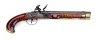 HIGH QUALITY ENGLISH FLINTLOCK HOLSTER PISTOL. Cal. 68 smooth bore. 8″ full octagon bbl signed “London”. Fine quality original flint lock marked “Hampton” with rain proof pan, flash shield, and roller-bearing frizzen. All steel furniture, all with high quality engraving with a pineapple finial on the trigger guard. Pistol has a single bbl key bolster with an oblong escutcheon. Pistol has a fine walnut stock with best quality checkering on the butt. Horn tipped ramrod. Thomas Hampton of Birmingham and London was active from 1807-1824. CONDITION: Excellent throughout with much of the original browning and only the most minor of dents and bruises. 4-33480 RGG36 (1,000-2,000)