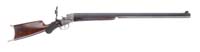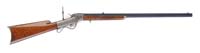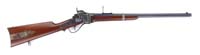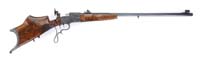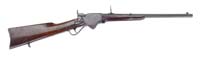 AUSTRIAN PERCUSSION RIFLE. SN NSN. Cal. 60. 36″ rnd bbl becoming oct within 7-1/2″ of breech, deeply rifled with 15 narrow grooves having right-hand twist. Front sight located 1/4″ behind muzzle & 2-leaf rear sight mounted 3-1/2″ in front of patented breech. Left side of bbl marked in circle with “E” over “LG” indicating the bbl is proved in Liege. Bottom of bbl marked with fancy Germanic script letters, probably “EE”, the number “36” & initials “G.M.”. Front-action lock is unmarked & held by one screw. This target rifle has adjustable set triggers that are covered with a very well made scrolled trigger guard. Balance of furniture includes a Schuetzen-style buttplate, and ramrod is retained by 3 metal ramrod thimbles. Attached to gun is its orig sliding triangular bayonet having engraved no. “6” at the ricasso. Orig leather sling also accompanies this rifle. Stock is a fine piece of walnut having a 6″ carved cheek rest; finely checkered on both sides of wrist & on forend. CONDITION: Bbl shows approx. 95% orig blue finish. Bbl tang, buttplate & lock plate show approx. 90% orig case colors. Trigger guard retains approx. 60% orig case colors. Every feature of this gun is top quality & in very fine condition. 4-35519 PAS63 (3,000-5,000)