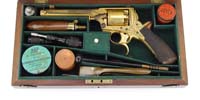 FINE CASE PAIR OF LEPAGE STYLE PERCUSSION TARGET PISTOLS. SN NSN. Cal. 54. Beautiful cased pair with unmarked 9-3/8″ Damascus pattern oct bbls, delicate dovetail front sights with fixed rear sights as part of the top tang. Left flat of bbls, just in front of breech plugs, has “ELG” in an oval Belgian proof marks with additional Belgian proofs on bottom under the wood and numbers “24 / 1634” on both bbls. They have unmarked front action stepped tail locks with delicate curved hammers and are mounted in very nicely figured European walnut 1-pc stocks with fluted butts & beautiful fluted buttcaps with turned finials. Furniture is all steel & beautifully engraved in foliate arabesque patterns with small shields behind rear sights on top tangs with initials “LF” over a prancing lion. Stocks, in addition to being fluted, are also deeply carved in intertwined foliate patterns. The fabulous presentation quality case is of beautiful rosewood with an empty cloud shaped brass inlay & brass edge inlays. Case has long brass hinges with a mortised brass lid support and a mortised brass lock. Interior is lined in royal purple velvet with maker’s name & address inside lid and bottom French fitted for pistols. It also contains an iron nutcracker ball mold with sprue cutter, a tiny bag-shaped flask, a beautiful rosewood handled combination turnscrew/nipple wrench with scallop shell ivory screw top on octagonal handle, a rosewood cleaning rod with jag & a rosewood rammer with brass tip. It also contains a rosewood mallet & a beautifully turned rosewood, barrell shaped cap box with screw cap & a pewter oil bottle. Left rear & right front corners have covered compartments, one of which contains a tiny wooden powder scoop. Right rear corner has a hole containing a worm. Altogether a very complete & orig set. CONDITION: Extraordinarily fine, probably unfired with both pistols retaining virtually all of their fine orig brown Damascus pattern on bbls & satin metal finish on all of other metal parts. Stocks are equally sound & new retaining virtually all of their orig piano varnish style finish with only a few minor nicks & scratches. Case has a grain check in the lid & is missing the right end brass edge from the lid, otherwise is spectacular and retains virtually all of its orig high quality hand rubbed varnish. Interior is moderately faded in lid & lightly faded in bottom. Accessories are all equally fine with a small chip in ivory cap on screwdriver. Mechanics are crisp, brilliant shiny bores. 8-76243 (8,500-12,000)