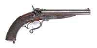 HIGH QUALITY FRENCH BREECH LOADING PERCUSSION DUELING PISTOL BY RENETTE. SN 157. Cal. 45. 10″ blued bbl signed “Invon Gastinne Renette a Paris”. All the furniture on this gun, including the buttcap and bbl tang, are finely engraved and show most of the original bluing and case hardening. Percussion lockplate is signed “Gastinne Renette”. The pistol grip is very finely checkered and the stock shows it original fine finish. Trigger guard is decorated with a relief gold crown over a gold monogram. By pulling down on the trigger guard, the bbl is moved forward to accept a paper cartridge. This is a very unique and fine example of a high quality breech loading firearm whose action is similar to the English Prince’s Patent of 1857. PROVENANCE: Dr.Frank Miller Estate Coll. CONDITION: Nearly new throughout. 4-35743 RGG31 (3,000-5,000)