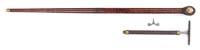 RARE WOOD GRAIN E.M. REILLY & CO. AIR GUN CANE WITH PUMP & KEY. Cal. About 36. Spectacular steel body, wood grain finish cane air gun with brass bbl that has microgroove rifling. The bbl end has about 18″ in length, having a brass cleaning rod with knurled cap that screws onto the tip and the entire cane is 38-1/4″ overall length with an egg shaped ivory knob about 2″ in diameter and about 2-3/4″ long. The knob has three scrimshawed oval panels: 1) a likeness of Horatio Lord Nelson, 2) his sailing ship H.M.S. Victory, 3) British royal crest. The three panels are separated by carved, deep relief, foliate patterns. Accompanied by a fine brown Damascus bodied air pump with brass ends, steel pump rod and flat screw-on handle. Body of pump is engraved “E.M. Reilly & Co. New Oxford St London”. Body of cane also has the company marking on the brass collar inside the joint. Also accompanied by the orig cocking key. This air gun cane functions by way of having the air reservoir under pressure in the top half with the bbl & trigger mechanism in bottom half. Just below the joint is the small fixed sight with a corresponding tiny blade front sight near the tip. Just forward of the joint is a small lever with a knob that when rotated to the right exposes the loading chamber for the lead ball. Once loaded the lever would be rotated back to the left, sealing the chamber. Then the cocking key would be employed in a square recess of bottom of bbl assembly which requires a quarter turn to cock the firing mechanism and bring the trigger, which is a small button on left side, into battery. Depressing the trigger releases the spring loaded firing device which strikes the air seal in top half of handle and then quickly recoils, releasing a charge of air to propel the bullet. PROVENANCE: Dr. Frank Miller Estate Collection. CONDITION: Very fine & functional. Body of cane retains about 95% strong orig wood grain finish with some pimpling & slight losses, mostly on top half. The ivory knob is wonderful with a very dark aged patina on the foliate carved areas with a fine ivory patina on three panels. Brass tip & ramrod are a light mustard patina. Mechanics are fine and seemingly function well although either the pump is not functioning properly or the reservoir seal needs attention. Bright shiny bore. Pump body retains about 80% orig dark brown Damascus pattern. 4-35689 JR507 (3,000-5,000)