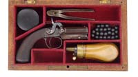 FINE CASED PAIR OF CALVERT FLINTLOCK PISTOLS. SN NSN. Cal. 62. Great little pair of pocket pistols with 2-7/8″ oct bbls with tiny dovetailed front sights. They have front action locks with roller, bridled frizzens & goosneck hammers. Lockplates are straight with stepped tails & short teats with sliding safeties. They are mounted in nicely figured French walnut 1-pc stocks with raised teardrop side panels & single wedges without escutcheons. Stocks have smooth bag shaped grips with tapered steel guards that are nicely engraved with beautiful pineapple finials. They have their orig ebony ramrods with brass tips. Accompanied by a walnut casing with brass reinforced corners & a floral brass inlay in lid engraved in script “JH”. The same style initials are engraved on rectangular silver thumbplates on pistol stocks. Interior of case is green felt lined & compartmented in bottom for the two pistols, a tiny brass powder flask that is atop an empty concealed compartment. Front 1/3 of case has a removable tray that contains a spectacular bone handled bullet mold with sprue cutter marked on one handle “IMPROVED / NO 23”. There is also a matching bone handled ramrod with combination worm that is all removable to expose a flash hole pick. There is also a heavy iron wrench, the purpose for which is undetermined. There is also a small dirk with 4-1/8″ dbl edged blade, oval brass handguard & turned ivory handle that matches the other two tools and has screw-off pommel cap. A most interesting set. PROVENANCE: Dr. Frank Miller Estate Collection. CONDITION: Pistols are extremely fine. Bbls retain most of their orig brown Damascus pattern, slightly faded. Lockplates retain dark case colors. Stocks are sound with minor nicks & scratches & retain most of their fine hand rubbed oil finish. One hammer is not solid in safety notch, otherwise mechanics are fine, bright shiny bores, probably unfired. Case has a couple of grain checks in lid and a crack across bottom, otherwise wood is sound. Interior shows moderate to heavy faded with light wear. Tools & implements are also fine with all of bone & ivory handles free of cracks. Dagger blade retains about 60% orig blue with about 70% orig gold. 4-35758 JR400 (4,000-7,000)