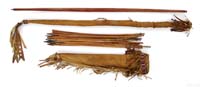 GROUP OF 9 EARLY POWDERHORNS & POWDER MEASURES. This small selection of horns includes 3 early powder measures and 7 horns, including a small pistol priming horn with early scrimshawed rosettes, one initialed “NH” (New Hampshire). Another nice small scrimshawed horn marked “James Thurston of Wolfborough NH” (New Hampshire), carved with various rosettes and other incised decorations; very nice late 18th or early 19th C. horn. A flattened priming horn with silvered charger & butt, small calling horn with tin mounts, together with 3 other small early horns. SIZE: Varies from 2-1/2” to 10”. CONDITION: Generally good. 9-93714-9 JDJ15 (500-900)