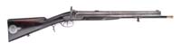 FRENCH BAILLOT & HEBERARD PERCUSSION RIFLE. Cal. 75. 29-3/4″ octagon to round Damascus bbl signed “Baillot & Heberard A Paris” along with a relief gold crown over “W.S.B.” This bbl has adjustable rifle sights and high quality engraving at the breech and bbl tang. Nickel plated lock is also profusely engraved. Rifle has a checkered wrist that is worn from use and the gun is equipped with sling swivels. Bbl is marked with Belgian proof, suggesting it was made in Paris using a Belgian bbl. PROVENANCE: Dr. Frank Miller Estate Coll. CONDITION: Clean and original throughout showing normal usage marks and bruises. 4-35716 RGG24 (2,500-4,500)