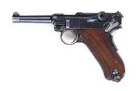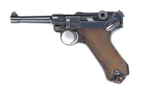 *DWM 1902 FAT BARREL COMMERCIAL LUGER. SN 23094. Cal. 9 mm. Early commercial Luger with 4″ heavy bbl (fat bbl) with dished toggles & grip safety. It has DWM scroll on front toggle link with bug proofs on bottom of bbl & “BU” proofs on left side of receiver. Front of frame has “GERMANY” export mark under serial number. Accompanied by an orig “CAL 9 MM” marked wood base magazine. A very rare model that is extremely difficult to find in any condition. PROVENANCE: Doug Smith Collection. CONDITION: Very fine, all matching except grips, firing pin & hold-open which are correctly unnumbered. Overall retains about 97% orig blue & 85% orig straw colors. Grips & magazine are extremely fine with sharp checkering & beautiful wood grain. Grip screws retain about 60% fire blued finish. Mechanics are crisp, bore is bright & sharp with very minor frosting. 4-36150 JR176 & BS (15,000-20,000)