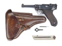 *EXTREMELY IMPORTANT ELABORATELY ENGRAVED KRIEGHOFF PRESENTATION LUGER. SN 25190. Cal. 9 mm. Extraordinary Kreighoff Luger with 4″ bbl with “KREIGHOFF SUHL” marking & “HK” & anchor logo on front toggle link with full serial number on left front side of receiver. Left side flat of frame is marked “Heinrich Kreighoff / Waffenfabrik / Suhl”. Remainder of pistol has nearly 100% coverage deep relief, Germanic style, oak leaf pattern engraving with fine stippled background. All flat surfaces have gold wire outline with a cloud shaped gold wire inlay around inscription on flat panel on left side of frame. Grip screws are also engraved. Fitted with extremely beautiful, special grade, carved oak leaf & acorn pattern walnut grips with checkered center medallion. Inside each grip is a pencil number “1”. Accompanied by its orig, matching numbered, machined stainless steel body aluminum base magazine with matching engraving patterns on base. Finish on this pistol appears to be orig bright metal but is in reality, a pickling process wherein the parts that were not to be pickled were gold washed & after pickling process the gold wash was removed. This pickling process leaves the surface slightly rough, on the order of rust bluing. It is apparent, upon close examination, that the engraved areas were gold washed prior to pickling leaving only the unengraved edges exposed which show this light roughness. Accompanied by a burgundy velvet lined English oak presentation box, custom fitted in bottom for pistol & one magazine with an empty lidded compartment. There is a brass disk inlay in the lid. This spectacular Luger is accompanied by a copy of an email from Carl Kleber of Worms, Germany dated May 2, 2008 & addressed to the consignor with the subject “History of Kreighoff Luger #25190”. Mr. Kleber states that this pistol was a birthday present for Josef (Sepp) Buerkel in 1943 who, prior to 1929, had been a teacher. At that time he joined the NSDAP (Hitler’s Party) and became a Gauleiter of “The West-Gau which covered the area of Western Germany – Rhineland – Palatone, up to the city of Koeln & down to Mannheim/Ludwigshafen & to the French border/Saarbruecken”. This was a very large area of that part of Europe. Mr. Kleber goes on to state that in 1944 Gauleiter Buerkel became disillusioned that Germany could win the war. He apparently spoke of this with his driver, Wilhelm Baer and apparently also spoke openly in the town of Kaiserslautern where he had his offices. Mr. Kleber states that his SS bodyguards reported his statements & Gauleiter Buerkel “died of natural causes”. Mr. Kleber also states that Gauleiter Buerkel had a hunting estate near Kerzeheim/Ramsen in the Staatswald and that the house is still standing in a very remote place. It had a well & power plant and was used as an emergency communications center & transmitter station for phone lines from Paris to Berlin. The family Jung from the Klauser-Hof took care of this estate. He goes on that toward the end of WW2 the driver, Wilhelm Baer, took all of the estate, papers, uniforms, etc. of Gauleiter Buerkel to the Klauser-Hof where he hid & he also hid the Luger & a lot of other guns. Wilhelm Baer was taken prisoner-of-war by the advancing American Army and spent time in the death camp at Bad Kreuznach, where he almost died. He was released in 1947. He returned to the Klauser-Hof and in 1949 married a daughter of the Jung Family. In 1974 this Kreighoff Luger was registered in his name when Germany introduced gun registration and it remained in his possession until he died in 2002. The Baer family sold off all of the possessions of Gauleiter Burkel & Wilhelm Baer with this Kreighoff Luger being the last item, which Mr. Kleber purchased himself. With this solid provenance, this is one of the very few, if not the only, documented presentation Kreighoff Lugers in the world for sale today and certainly is one of the finest ever made. PROVENANCE: Doug Smith Collection CONDITION: Extraordinarily fine, all numbered parts are matching. Overall retains virtually all of its bright pickled finish with clean crisp engraving & bright gold. Grips are extremely beautiful & sound and retain most of their orig oil finish. Mechanics are crisp, strong bright bore with fine pitting in grooves. Magazine is near mint. Case is extremely fine with minor nicks & scratches & slight wear internally. 4-36115 JR233 & BS (75,000-125,000)