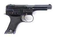 **SPANISH SUPER AZUL MACHINE PISTOL. SN 31218. Cal. 7.63mm. Manufactured by Eulogio Arostegui. The Super Azul machine pistol is a close copy of the popular Mauser machine pistol. 5 1/2″ bbl. Blue finish with two panel wooden pistol grip. Tangent rear sight elevation adjustable from 50-100m. Complete with wooden holster/shoulder stock with leather wrap and cleaning rod. Leather wrap stamped “Aphhoffmann Berlin 1916”. Includes five 20-rnd magazines marked “Mauser” on floor-plate. CONDITION: Very fine. Bluing is deep and dark with very few blemishes, if any. Wooden pistol grip panels have slight handling wear on right side. 4-33461 JZ18 (4,000-7,000)