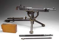 **MAXIM MG08 ON SLED MOUNT. SN 46927. Cal. 7.92mm. Maxim MG08 machine gun mfg. by DWM, Berlin, 1918. This magnificent example of one the earliest machine guns is extremely clean. Most major components including feedblock, bbl jacket, grips and sights are orig and matching numbers. Bbl is very clean with extremely pronounced rifling. Wooden grips are deeply checkered and oil brushes in grips may possibly be unused. Sled mount is in fantastic condition but missing small components, accessories and oil covers. Mount function is smooth. Lot includes armor plate on front of bbl jacket, spare bbl in leather sheath, 200 rnd Maxim belt, optical sight base, spare lock mechanism, spare bbl bushing, and most exciting, orig water can stenciled with the following phrase “Souvenir of American Victory, st. Mihiel, Sept. 12-16th, 1918”. CONDITION: Very fine plus. Everything cycles smoothly and appears to function correctly when operated by hand. Both gun and mount are in exceptional condition with most major parts matching numbers. Fantastic collection of orig accessories only bolsters this fine piece. 4-35199 JZ6 (16,000-18,000)