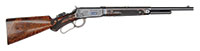 EXCEEDINGLY RARE SPECIAL ORDER DELUXE ENGRAVED WITH GOLD TAKEDOWN WINCHESTER MODEL 94 LEVER ACTION SHORT RIFLE. SN 139319. Cal. 25-35. Outstanding & rare deluxe Model 1894 short rifle with 18″ full matted oct to rnd bbl, half magazine with Lyman ivory bead front sight, Lyman 6A folding rear sight and a Lyman combination tang sight. Mounted with extremely beautiful center crotch flame grain American walnut with Style D carved forearm & capped pistol grip stock with smooth steel buttplate. Left side of lower tang, under the wood, is stamped with assembly number “16027”, “XXXX” and “R”. Matching assembly number is stamped in top tang channel of buttstock along with “94”. Buttplate is not numbered although there appears to be some pencil writing that is indecipherable, however there is no doubt whatsoever that this buttplate is orig to this rifle. Receiver is engraved in style 4, probably by John Ulrich. Engraving consists of the very large vignette of a hunter standing behind a tree having shot two bull elk, all in an extremely detailed forest scene. Each end of vignette is engraved with flowing foliate arabesque patterns with shaded background. Right side of receiver has the engraved vignette of a grizzly bear on a mountain precipice with matching foliate arabesque patterns fore & aft. Both sides have wavelet borders. Screw heads are also engraved. Top & bottom edges of receiver are engraved with snake & dot patterns with light foliate arabesque patterns over receiver ring, floorplate, forend cap, buttplate tang and over chamber area of bbl. Sides & edges of lever & hammer are engraved to match. Rear edge of receiver, front edge of takedown ring, end of bbl at the receiver and forend cap are inlaid with flush gold wire. Heel of buttplate is also inlaid with gold wire. Accompanied by a Cody Firearms Museum letter identifying this rifle in caliber 25-35 with 18″ 1/2-oct matted bbl, plain trigger, fancy pistol grip stock with carved style D pattern, half magazine, engraved $24.00, takedown and shotgun butt, received in the warehouse Dec. 13, 1902 and shipped the same day to Order #166248. This fabulous little rifle was formerly in the collection of renowned old time collector, Eldon Owens. PROVENANCE: Eldon Owens Collection; Wes Adams Estate Collection. CONDITION: Extremely fine, all matching except buttplate as noted. Bbl retains 96-98% strong orig blue with light muzzle edge wear and a couple of minor thinned areas; magazine tube retains virtually all of its orig blue; forend cap retains about 98% glossy orig blue as does the takedown ring; receiver retains 95-97% glossy orig blue with only high point and fine sharp edge wear; loading gate retains about 98% orig fire blue; lever & hammer retain most of their brilliant orig case colors, lightly faded on outer face of lever; buttplate retains about 80% strong blue showing wear at heel & toe and around edges; wood is sound with a very few, very minor handling & storage nicks & scratches and retains virtually all of its orig piano varnish finish. Mechanics are crisp, bright shiny bore. 4-44376 JR (90,000-125,000)
