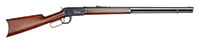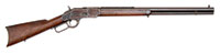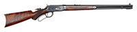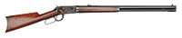 *RARE WINCHESTER MODEL 1886 SADDLE RING CARBINE. SN 144649. Cal. 50-100-450. Scarce standard grade carbine in a rare caliber, with 22″ bbl, full magazine, square base front sight with German silver blade & carbine ladder rear sight. Left side of receiver has a stud & ring. Mounted with nicely figured, uncheckered, slab-sawed American walnut with straight stock & carbine buttplate. Accompanied by a Cody Firearms Museum letter which identifies this carbine in the caliber as noted, received in warehouse Feb. 5, 1909 and shipped next day to Order #192464. The 50-100-450 caliber was offered only fifteen years during the period 1895 – 1910. Given the very heavy bullet and commensurate brutal recoil, very few rifles or carbines were ever produced chambering this round. Few of those arms are found today with high orig finish, especially carbines. PROVENANCE: Wes Adams Estate Collection. CONDITION: Fine to very fine. Bbl & magazine tube retain 97-98% strong orig blue with a few tiny freckles of surface rust on top of the bbl; receiver retains 65-70% orig blue with most of the balance having flaked, not worn, to a medium patina; hammer retains strong, bright case colors, turned silver on top edge; lever retains bright case colors on sides, turned silver on outer faces; buttplate retains about 90% strong orig blue. Wood is sound with a few light handling & storage nicks & scratches and retains nearly all of its strong orig factory finish. Mechanics are crisp, brilliant shiny bore, shows very little use, just poor storage. 4-44513 JR36 (15,000-25,000)