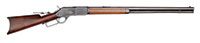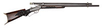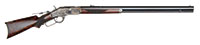 VERY RARE SPECIAL ORDER EXTRA HEAVY DELUXE WINCHESTER MODEL 1873 LEVER ACTION RIFLE. SN 192643. Cal. 44 WCF (44-40). Spectacular special order deluxe rifle with 30″ extra heavy oct bbl that measures 1″ across the flats, full magazine, half nickel front sight, semi-buckhorn rear sight and tang sight with 4″ staff. Mounted with very highly figured, burl & flame grain American walnut with “H” style checkered forearm and serpentine pistol grip stock with black triangle inlay and crescent buttplate with trap. Left side of lower tang is stamped with assembly number “588” and three, larger than normal “X”s. The matching assembly number is found in top tang channel of buttstock and inside toe of buttplate. The number in the top tang channel of the buttstock appears to have been re-stamped over the orig number. Accompanied by a Cody Firearms Museum letter which identifies this rifle in 38 caliber with 30” extra heavy oct bbl, plain trigger, checkered stock with pistol grip and case hardened, received in warehouse Oct. 8, 1885, shipping date & order number are blank on the record. It was “repaired and changed to 44 caliber on July 14, 1891”. Also accompanied by a copy of the shipping record. PROVENANCE: Wes Adams Estate Collection. CONDITION: Extremely fine. Bbl retains 96-98% strong orig factory blue with very light muzzle & sharp edge wear; magazine tube retains 98-99% strong orig blue; receiver retains about all of its orig case colors, brilliant in sheltered areas, lightly faded but strong elsewhere; hammer retains about all of its brilliant case colors; lever retains brilliant case colors on sides, faded on outer faces; buttplate retains brilliant case colors on the tang, lightly to moderately faded on the face, showing wear on heel & toe; forend cap retains bright case colors on left side, fading to silver on right side; wood is sound with light nicks & scratches showing moderate diamond point wear and retains most of an outstanding professionally restored finish. Mechanics are crisp, brilliant shiny bore; has been fired but very little, retains most of its orig factory blue on bolt face. 4-44562 (20,000-35,000)