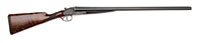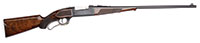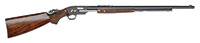 *EXTRAORDINARILY RARE SPECIAL ORDER ENGRAVED & GOLD INLAID SAVAGE MODEL 1899 LEVER ACTION RIFLE WITH CARVED STOCK FOR AUTO MAGNATE JOHN F. DODGE. SN 184078. Cal. 250-3000. Exceptional Savage rifle with 22″ tapered rnd bbl that has full raised matted rib with pedestal mounted gold bead Sheard front sight and an extremely unusual custom V-notch rear sight with slide elevator graduated to 1,000 yards. Rifle is mounted with exceptional marblecake French walnut with perch belly stock & schnable tip forearm that is elaborately relief carved with vines, leaves & clusters of grapes that has a fine stippled background. Stock has raised side panels with fleur-de-lis drop points and a scalloped edge pearl grip cap with gold screw. All screws are gold plated. Receiver has full coverage, extraordinary, intertwined, very fine foliate arabesque patterns over the entire surface except for the two game scene vignettes on sides. Left side has two highly detailed raised gold crouching tigers in a field scene with hills in background. Right side is inlaid with a very highly detailed gold bugling bull elk and a hind in a forest scene with very fine stippled background. Bottom of receiver is inlaid with intertwined, elaborate gold initials “JFD” (John F. Dodge) of the Dodge motor car company. SN is inlaid in gold. Bolt is engine turned (jeweled) on the right side and relief engraved with foliate arabesque patterns at rear edge of the top flat with balance of bolt relieved with fine stippling. Lever post, sides & face of lever, takedown ring & buttplate are engraved to match. Trigger has a very fine checkered face with stippled sides. Buttplate is checkered steel and gold plated. The receiver is mounted with a Marbles spring loaded tang sight. The engraving & carving on this rifle are of the very highest order done by a superior master engraver & wood carver. PROVENANCE: Wes Adams Estate Collection. CONDITION: Exceptionally fine, probably unfired. Overall retains virtually all of its crisp, orig factory finish with bright blue and bright case colors; outside face of lever is faded to silver; wood is sound with a couple of very minor handling & storage nicks and overall retains virtually all of its orig factory oil finish. Mechanics are crisp, brilliant shiny bore, probably unfired. 4-44809 JR (125,000-150,000)