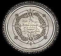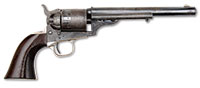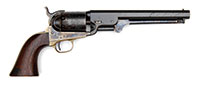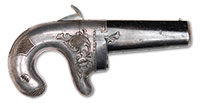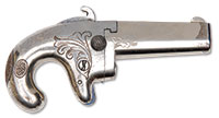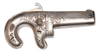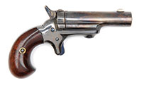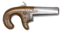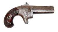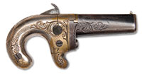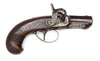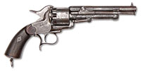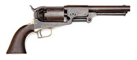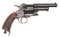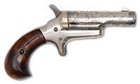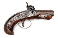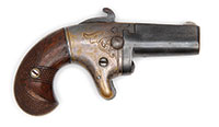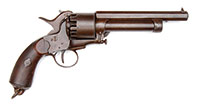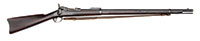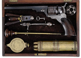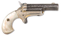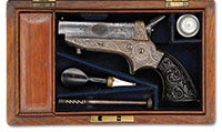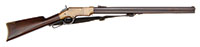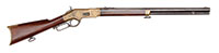 EXTREMELY RARE WINCHESTER BRIGGS PATENT LEVER ACTION RIFLE. SN 1. Cal. 44 RF Henry. This very famous and well documented Briggs Patent rifle has been found in several very well known collections for many years. It is described as having a 24″ rnd bbl with full magazine and two carbine style bands, the front of which is brass and the rear is blued steel. The brass band has an integral brass sling loop with sling eye on bottom of stock. Bbl is mounted with a windgage, ivory bead, combination front sight and Henry 900 yard ladder rear sight. It also has a later added tang sight with 4″ staff. Receiver is that of a late style Henry rifle and it has a small brass forearm which has a screw-head button latch on right side that, when depressed, allows the forearm to slide forward exposing a cutout in the magazine tube to load cartridges. Mounted with very highly figured, burl & flame grain, uncheckered American walnut with straight stock & late Henry style brass buttplate with trap. Left side of lower tang is stamped with the SN “1” and an “E”. The matching SN is found in top tang channel of buttstock and inside toe of buttplate. Receiver is spectacularly engraved with the large oval vignette on the left side plate which is engraved in period script “Presented to / W.C. Dodge Esq. / by the New Haven Arms Co. / as a Testament of voluntary services / in behalf of Breech Loaders / 1865”. This vignette is surrounded by very well executed foliate arabesque patterns with fine punch dot background and a zig zag border. Left front flat is wonderfully engraved with a spray of flower blossoms & leaves with fine punch dot background. right sideplate has the engraved, oval vignette of a wonderfully detailed Spanish style mission with a cross over one turret, mountains in the background and desert style foliage in foreground, all surrounded by foliate arabesque patterns and a zig zag border. Right front flat is engraved identically to the left side and the transition flats between sideplates & front flats are engraved with Nimschke style feather patterns. Top front edge of receiver is engraved in foliate patterns. The top of receiver, top tang & brass forearm are lightly engraved with foliate arabesque patterns with punch dot background. All of brass was originally gold plated. The bottom tang is fitted with an unusual swinging lever latch, probably an experimental or prototype. All screws are Henry type. This famous rifle is pictured on the first page of Chapter 7, the Model 1866 chapter of The Winchester Book, Madis. In one of these photos it is pictured without a rear sight and has a tang sight. It is also pictured in full detail with three photos on p. 30 of The Book of Winchester Engraving, Wilson with credit to the Norm Flayderman Collection. In these photos it has the Henry style rear sight. It has a full page, p. 39, in color, in the book, Winchester Engraving, Wilson, at which time it had no rear sight. This famous rifle has appeared in numerous other publications & articles over the years. PROVENANCE: Norm Flayderman Collection; Wes Adams Estate Collection. CONDITION: Very fine. Bbl & magazine tube retain about all of a fine professional restoration showing light wear from the sliding forearm; forearm & receiver retain traces of gold in the engraving with lightly worn edges and overall retain a dark mustard patina; buttplate is matching condition with a few small spots of stain; stock is sound with a few minor nicks, dings & scratches and retains about all of a very fine professionally restored finish. Mechanics are fine; strong, frosty bore, dark in the grooves. 4-44558 (75,000-125,000)