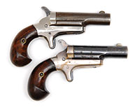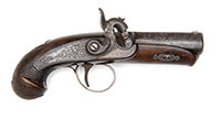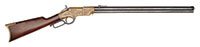 OUTSTANDING DELUXE ENGRAVED WINCHESTER MODEL 1866 LEVER ACTION RIFLE. SN 38058. Cal. 44 RF Henry. Outstanding early rifle with 24-1/4″ oct bbl, full magazine, combination front sight and a replacement fixed rear sight with tang sight that has a 3-3/4″ staff. Mounted with very highly figured flame grain uncheckered American walnut with straight stock and crescent brass buttplate with trap. Bottom of stock has a factory sling swivel with corresponding swivel in the forend cap. Left side of lower tang under the wood is stamped “XX” with large initials “JF”, a “B” and an “O”. Top tang channel of buttstock has last four digits of SN which number is also found inside toe of buttplate. Rifle is engraved by one of the Ulrichs, probably John, with wonderfully detailed foliate arabesque & Moorish patterns on both sides with very fine punch dot background. Top of receiver, top tang, bottom tang and forend cap are also lightly engraved. Bottom of receiver & carrier are engraved with mirror image patterns and buttplate tang is engraved in a geometric pattern. This is a very fine beautiful ’66 with wonderful engraving. PROVENANCE: Wes Adams Estate Collection. CONDITION: Very fine, all matching. Bbl retains 93-95% slightly thinned orig blue with muzzle & sharp edge wear; magazine tube retains about 95% strong orig blue with a thinned spot just above the forend cap which corresponds with a wear spot on the bbl; receiver retains fairly sharp edges showing only light wear and overall the receiver, forend cap & buttplate retain a pleasing medium mustard patina; wood is sound with light nicks & scratches and a few dings on bottom of stock and overall retains most of a very old professionally restored finish. Mechanics are crisp, strong bright bore with moderate pitting. 4-44555 (30,000-50,000)