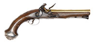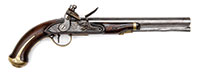 *MAUSER C96 POST WAR MAUSER BANNER BOLO WITH FRENCH RETAILER MARKINGS. SN 512275. Cal. 7.63mm. Post-war Mauser Banner Bolo with 4″ bbl and 50-1000 rear sight. This standard production gun is distinguished by the French retailer marking applied to the top of the bbl “Manufacture Francaise d’Armes & Cycles de Saint-Etienne”. Disassembly shows all matching components including the grips with each panel fully serial numbered to the gun. Complete with a correct Mauser Banner Bolo shoulder stock matched to the pistol. PROVENANCE: Ralph Merrill Collection CONDITION: Pistol has 95% orig rust blue with comparable condition fire blue small parts. Stock with orig varnish except where small cracks have been repaired. Faded hinge with patina and most of the fire blue on the lug has faded to a gray patina. French retailer marked C96s are seldom seen and all orig matching rigs are even rarer. (C&R). 4-47265 LMA40 (2,500-4,500)
