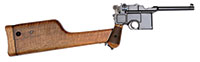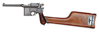 *MAUSER C96 MODEL 1930 COMMERCIAL WITH MAUSER BANNER STOCK. SN 828675. Cal. 7.63mm. Mid-production M1930 Commercial with 5-1/2″ bbl and 50-1000 rear sight. SN on left side of chamber. Bbl extension grooved on each side. Pistol has been nicely refinished with a salt blue and all small parts have been reheated to a lustrous purple-blue. Orig grips. Complete with correct and orig unnumbered Mauser Banner shoulder stock whose hardware has been reheat treated to a fire blue. PROVENANCE: Ralph Merrill Collection CONDITION: Pistol has nearly 100% of refinished salt blue and reheat treated small parts. Near excellent bore with strong rifling and minor frosting. Stock has never been sanded and has a scattering of small surface dings. Fittings retain nearly 100% of their restored fire blue. (C&R) 4-47267 LMA42 (2,000-3,000)