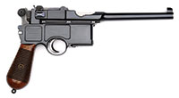 *MAUSER C96 LATE SALT BLUED MAUSER BANNER BOLO. SN 714229. Cal. 7.63mm. Mauser salt blued the last of its Mauser Banner Bolos. The first of these guns often had a purple hue and this is no exception. Bolo features include a 4″ bbl, short extractor, 50-1000 rear sight, two lug firing pin and small ring “NS” marked hammer. Usual address markings on chamber and Crown “U” on left chamber flat. Full SN on left side of bbl extension. Matching numbers on bolt stop, bolt, hammer, subframe and frame. Floorplate is a reblued replacement. Grips are original with each panel marked with full SN. Lanyard ring is present. Accompanying the gun is an excellent Mauser Banner shoulder stock whose lug was renumbered “229” to match the gun. PROVENANCE: Ralph Merrill Collection CONDITION: Pistol is 97% salt blue with purple toning as mentioned in description. Rear of right frame has mild rust freckling with trace pitting just above the right grip panel. Sharp edge wear under trigger guard and front grip strap from handling. Rear grip strap shows contact from stock lug. Replaced floorplate is incorrectly polished and has a blue tone different from the rest of the pistol. Excellent original grips. Small parts with about 70% original fire blue in a normal wear pattern. Bright bore with moderate corrosion. Mauser banner stock is in truly excellent condition with only a few minor handling dings. Fire blued hinge has at least 98% of its original finish with patchy areas of congealed grease. Lug would have been just as nice if the upper arm had not been renumbered to match the gun. A great looking rig. (C&R). 4-47263 LMA107 (2,500-3,500)