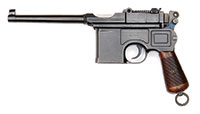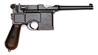 *C96 MAUSER EARLY RED 9 SERIES WITHOUT RED 9 GRIPS. SN 2333. Cal. 9mm Parabellum. Early production Red 9 with 5-1/2″ bbl and 50-500 rear sight. Imperial marking on right side of bbl extension. Disassembly shows all matching components including finely grooved grips. PROVENANCE: Ralph Merrill Collection CONDITION: 90-95% orig rust blue with comparable condition, fire blue on small parts. Bright mirror bore with strong rifling. This is one of the very few early “Red 9s” whose grips were not marked with a Red 9. (C&R) 4-47251 LMA27 (2,000-3,000)