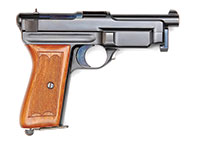 *HIGHLY DESIRABLE BEISTEGUI HERMANOS MM31 WITH DETACHABLE MAGAZINE. SN 31496. Cal. 7.63mm. Only a few Beistegui Hermanos MM31s were factory modified to fire as strict semi-automatics. This example has a 5-1/2″ bbl, short extractor, slip-in 50-1000 rear sight, two lug firing pin, small ring hammer. Full SN is on left chamber flat. Matching numbers are on bolt stop, bolt, hammer, subframe and frame. Disassembly shows matching subframe numbers. Beistegui grips are correct and unnumbered. 20-shot mag is from a Mauser 712 and marked with Mauser banner on floorplate. Replaced lanyard ring. PROVENANCE: Ralph Merrill Collection CONDITION: Pistol has about 95% original blue with a few scratches under bbl and wear on each side of the bbl extension rail. Front and backstraps are thin as might be expected from moderate handling. There is little heat treatment left on trigger. Most of other small parts have about 70% of their original fire blue. Bore with strong rifling and minor frosting in grooves. One of the most desirable Beistegui pistols. (C&R). 4-47285 LMA106 (5,000-10,000)