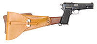 *MAUSER C96 FRENCH GENDARME WITH CORRECT STOCK. SN 433557. Cal. 7.63mm. Standard post-war French Gendarme with 4″ bbl and 50-500 rear sight. The French Gendarmes had a Bolo top and full size frame with most having hard rubber grips. Hammer is marked “NS” and solid safety. Disassembly shows an all matching gun including grips that have the full serial number scribed on each panel. Complete with correct oak stock whose lug is a reproduction replacement. PROVENANCE: Ralph Merrill Collection CONDITION: Pistol with 90-93% orig rust blue with most wear involving bbl, front strap and backstrap. Small parts having about 75% orig fire blue. Stock with orig varnish. A nicely presenting Gendarme rig. (C&R). 4-47260 LMA35 (2,500-4,500)
