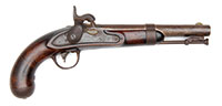 RARE WINCHESTER MODEL 1895 LEE NAVY STRAIGHT PULL RIFLE. SN 8609. Cal. 6 mm Lee Navy. Navy musket with 28″ tapered rnd bbl, square base blade front sight and 2,000 yard musket ladder rear sight. Receiver has the 2-line Winchester address on left side and is marked over the chamber “-U.S.N.- / an anchor / NO 8609 / -N.C.T.-“. Mounted in a full length, uncheckered, straight grain American walnut stock with semi-pistol grip and Model 1895 carbine/musket buttplate with trap. It also has a short handguard and two bbl bands. Front band has a bayonet lug & stacking swivel and the middle band a sling loop with a corresponding sling base in the buttstock and another in front of the trigger guard/magazine box. Accompanied by a Winchester sling swivel. Also accompanied by all three of the different manufacturers’ bayonets & sheaths made for this rifle: 1)Winchester; 2) Remington; 3) Unknown maker whose mark is a “T” in a triange on right ricasso. All three bayonets are virtually identical with 8-1/4″ spearpoint blades, thick steel handguard/bbl loop and 2-pc wood scales. All three are accompanied by their orig steel & leather sheaths. Also accompanied by an extremely rare orig copper plated 5-rd stripper clip with patent date on the rear face, containing five orig soft point cartridges. Additionally accompanied by a Mills tan canvas cartridge belt with 44 cartridge loops containing 33 orig soft point cartridges. Additionally accompanied by an orig blue navy Mills canvas & brass cartridge belt with 12 clip pouches that have leather covers and shoulder straps with brass attaching hooks. Also accompanied by an orig red cover 16-page catalog advertising the Lee Navy musket & sporting rifle. This catalog is undated but was likely printed prior to 1902 when production ceased on this rifle. Finally accompanied by a Cody Firearms Museum letter which identifies this rifle as having been received in the warehouse May 19, 1897 and shipped next day to Order #8497. The Lee Navy straight pull rifle was the invention of James Paris Lee, a former employee of Winchester who struck out on his own and patented this straight pull bolt system which he successfully marketed to the Navy. According to Flayderman’s Guide to Antique American Firearms there were about 20,000 Lee Navy rifles produced in the period 1895 to 1902, of which about 16,700 were on military contract. 623 of the first contract were issued to the U.S. Marine Corps 1st Marine Battalion, the first U.S. forces landed in Cuba during the Spanish-American War and the first U.S. forces to come under enemy fire. The Lee Navy muskets saw extensive service with the Navy & Marines in the Spanish-American War and to a lesser extent in the Philippines and the Boxer Rebellion in China. A large group of these rifles were on the USS Maine when she was sunk in Havana Harbor, only 34 of which were recovered in 1900. All 34 SNs are known. PROVENANCE: Barnes Family Collection. CONDITION: Good. No orig finish remains being an overall gray/brown patina with fine pitting on the receiver, top edge of bolt, trigger guard/magazine box & buttplate. Wood is sound with light handling & storage nicks & scratches and retains most of an old restored finish. Mechanics are fine, strong bright bore, frosty in the grooves. Winchester bayonet is crisp & clean, sheath is fine showing moderate wear; Remington bayonet is fine with bright blade & worn handle, sheath is very fine; Unknown maker bayonet has lightly pitted bright blade with oil stained grip scales & crisp bright sheath. Clip of ammo is very fine. Catalog is fine with bright red covers. Tan cartridge belt is very fine, lightly soiled; blue cartridge belt is very fine, moderately faded, showing a little wear in a couple of places. Altogether a very rare compilation of related material. Although this rifle is not listed as one of the ones recovered from the “Maine”, it has all the appearances of others from the “Maine” that have been examined by this cataloger. 4-47628 JR266 (4,500-7,000)