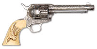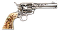 RARE HALF NICKEL FACTORY ENGRAVED WINCHESTER MODEL 1873 LEVER ACTION RIFLE. SN 127938. Cal. 44 WCF (44-40). Beautiful ’73 with 24-1/4″ oct bbl, full magazine, half nickel front sight and short semi-buckhorn rear sight with checkered edges. Mounted with very nicely figured, center crotch,flame grain American walnut, uncheckered, with straight stock & crescent buttplate with trap containing a 4-pc brass & iron cleaning rod. Receiver has a sgl set trigger. Left side of lower tang is stamped with assembly number “4835”, “XXX” and an “R”. Matching assembly number is found in top tang channel of buttstock which also has an “S”. Matching number is also stamped inside toe of buttplate. Receiver, forend cap & buttplate are nickel finished. Receiver & sideplates are engraved by one of the Ulrichs, probably John. Engraving consists of the small rnd vignette of a standing whitetail buck in a field & forest scene with foliate arabesque patterns fore & aft with one scroll terminating in a large flower blossom. Front & rear flats of receiver are engraved to match. Right side has matching engraving with foliate arabesque patterns terminating in a large flower blossom on the sideplate. Top & bottom of receiver, dust cover, top tang, forend cap & buttplate tang are engraved to match. This exact rifle, identified by SN, is pictured, both sides, on p. 190 of the book Winchester Engraving, Wilson. Accompanied by a Cody Firearms Museum letter addressed to renowned Winchester researcher, author & authority, George Madis, which identifies this rifle with oct bbl, set trigger, fancy nickel trim & engraved; received in warehouse July 11, 1883 and shipped same day with four other arms to Order #4755. Such early 1873s are rarely found with nickel trim and engraved. PROVENANCE: Wes Adams Estate Collection. CONDITION: Extremely fine, all matching. Bbl & magazine tube retain 98-99% strong orig factory blue with only very light sharp edge wear and slight thinning in one spot on magazine tube and a few pin pricks of light surface discoloration over forearm area; receiver, dust cover & forend cap retain virtually all of their strong, bright, orig nickel with a few pin pricks of flaking on receiver and some minor flaking on bottom rear edge; buttplate retains about 96% orig nickel turned milky with wear on heel & toe; hammer retains about all of its orig factory case colors, turned a little dark; lever retains bright case colors on sides, faded on outer faces; wood is sound with a few very minor nicks & scratches with some oil staining around tangs and overall retains most of its orig factory varnish. Set trigger needs adjusting, otherwise mechanics are crisp, brilliant shiny bore, may be unfired; bolt face retains virtually all of its orig factory blue. 4-44568 (20,000-35,000)
